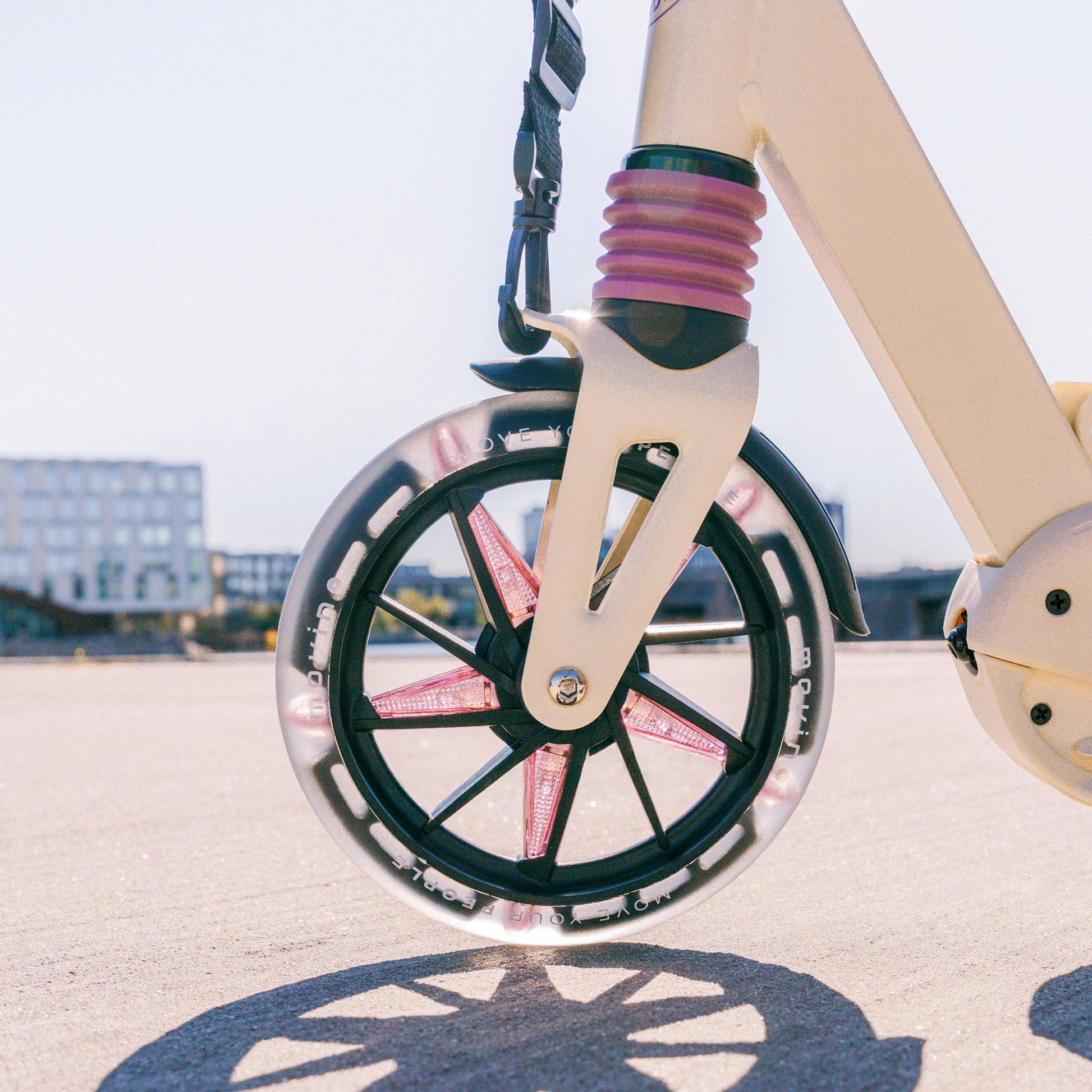 Double LEDs in the core and in the PU layer light up every wheel rotation. The higher the speed, the stronger the lighting effect – full brightness and a style that attracts attention. The Movino City Light not only looks amazing but also ensures safety – you are visible from a distance, even after dark.