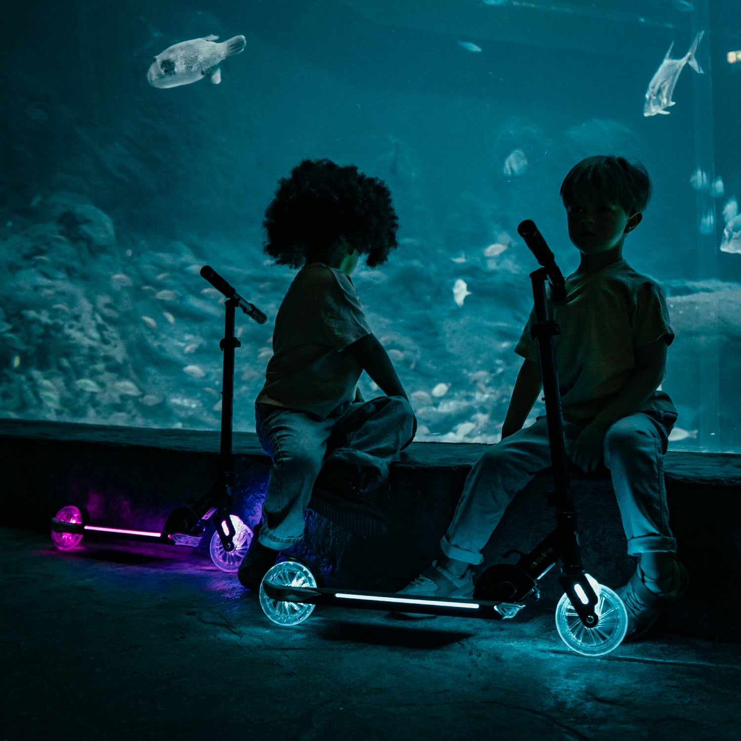 The lights on the Cosmo 2 scooter are visible even on the sunniest of days! Not every scooter can do that. Ordinary LED lights don’t provide such a spectacular effect and only work when the scooter is in motion. The Cosmo 2 lights up even when it’s not moving. Just press a button. The lights are powered by AA batteries.