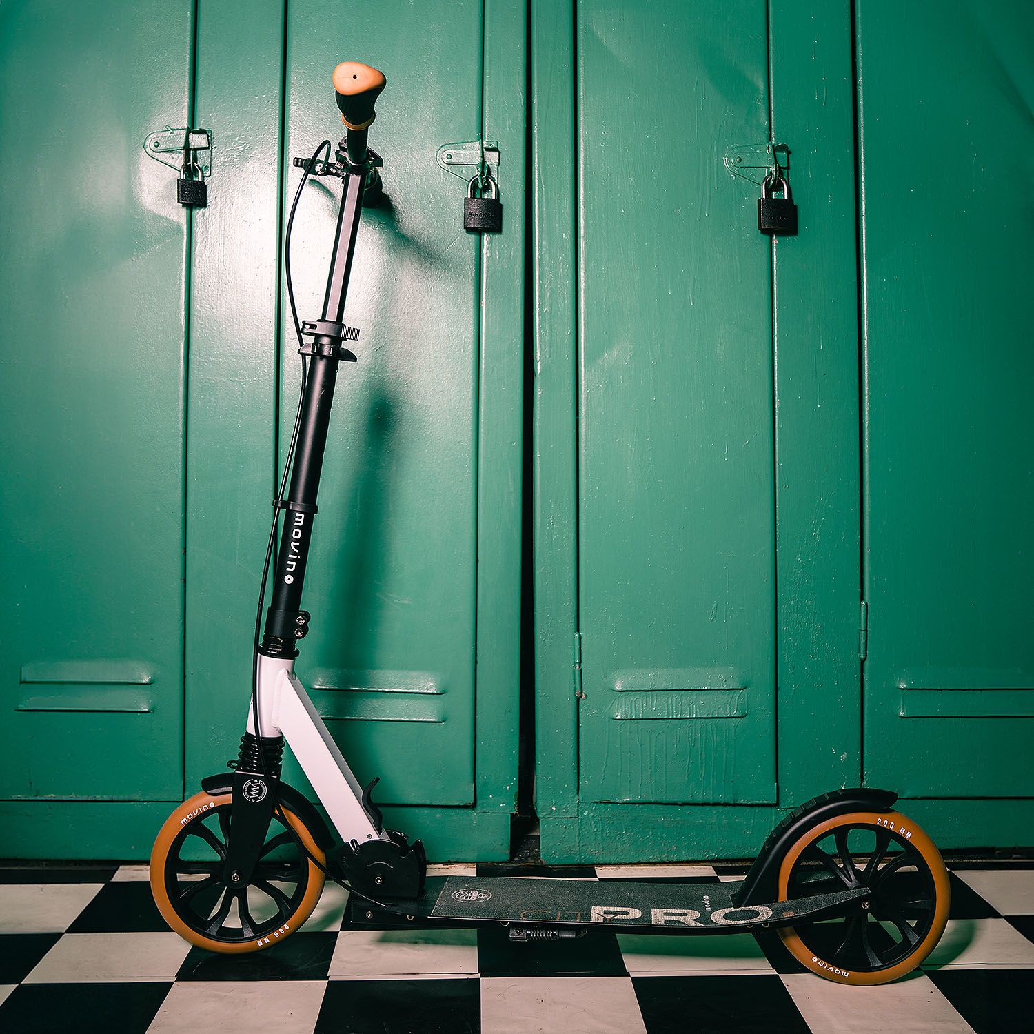 La trottinette urbaine Movino City Pro est équipée de grandes roues de 200 mm de diamètre avec des roulements de haute qualité, de classe ABEC-7. Grâce à elles, vous pouvez vous déplacer sans encombre sur les rues, trottoirs et pistes cyclables. La combinaison du frein à pied et du frein à main permet à la trottinette de s'arrêter rapidement et en toute sécurité, exactement quand vous en avez besoin.