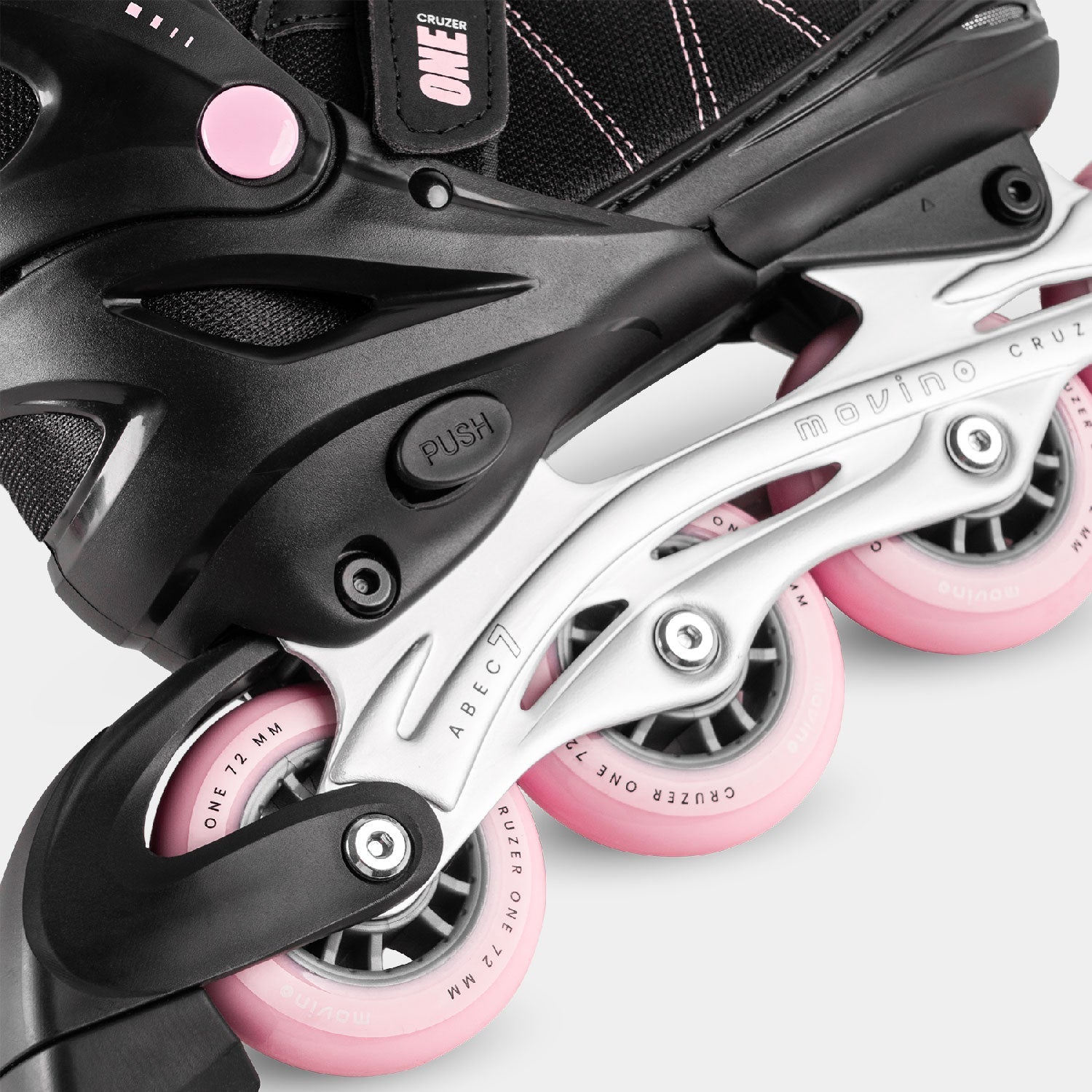 Les Movino Cruzer One sont des patins conçus pour plusieurs saisons de glisse active. Ils disposent d'un ajustement de taille en 4 étapes. Le système de réglage est rapide et fiable. Il suffit de détacher la sangle, d'appuyer sur le bouton "PUSH" et de régler la longueur du patin à la taille souhaitée.