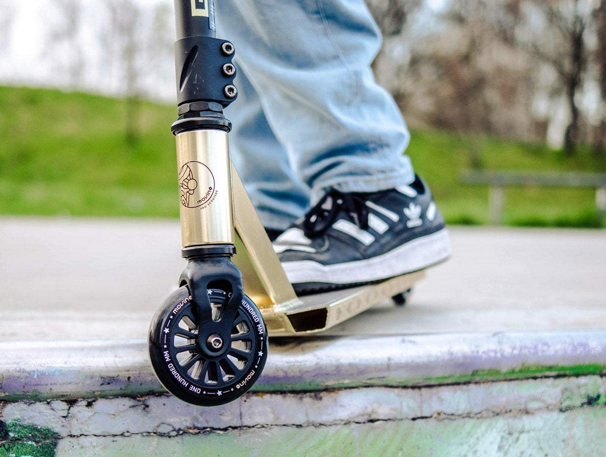 Faites sensation au skatepark ! La Movino Glide arbore un plateau doré brillant qui attire tous les regards. Les motifs de crânes sur les bords latéraux du deck complètent son look unique. La trottinette Movino Glide est également disponible en d'autres coloris : rouge, bleu, teal et neochrome.