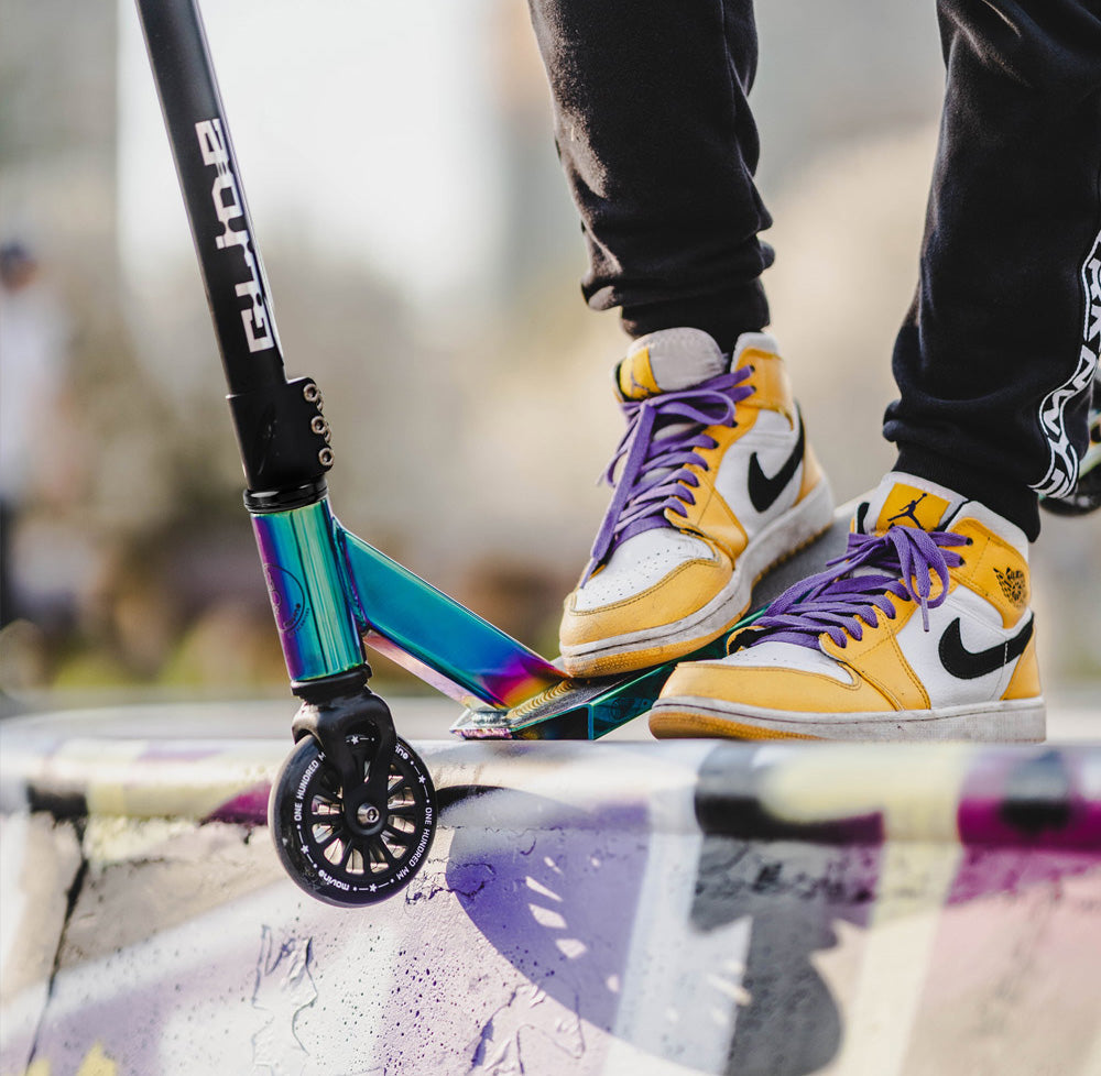 Les reflets hypnotiques du deck psychédélique en couleur néochrome attireront l'attention des autres riders, surtout lors des évolutions exigeantes. C'est une toute nouvelle qualité de glisse. Vous trouverez également la trottinette Movino Glide dans d'autres variantes de couleurs : dorée, teal, bleue et rouge.