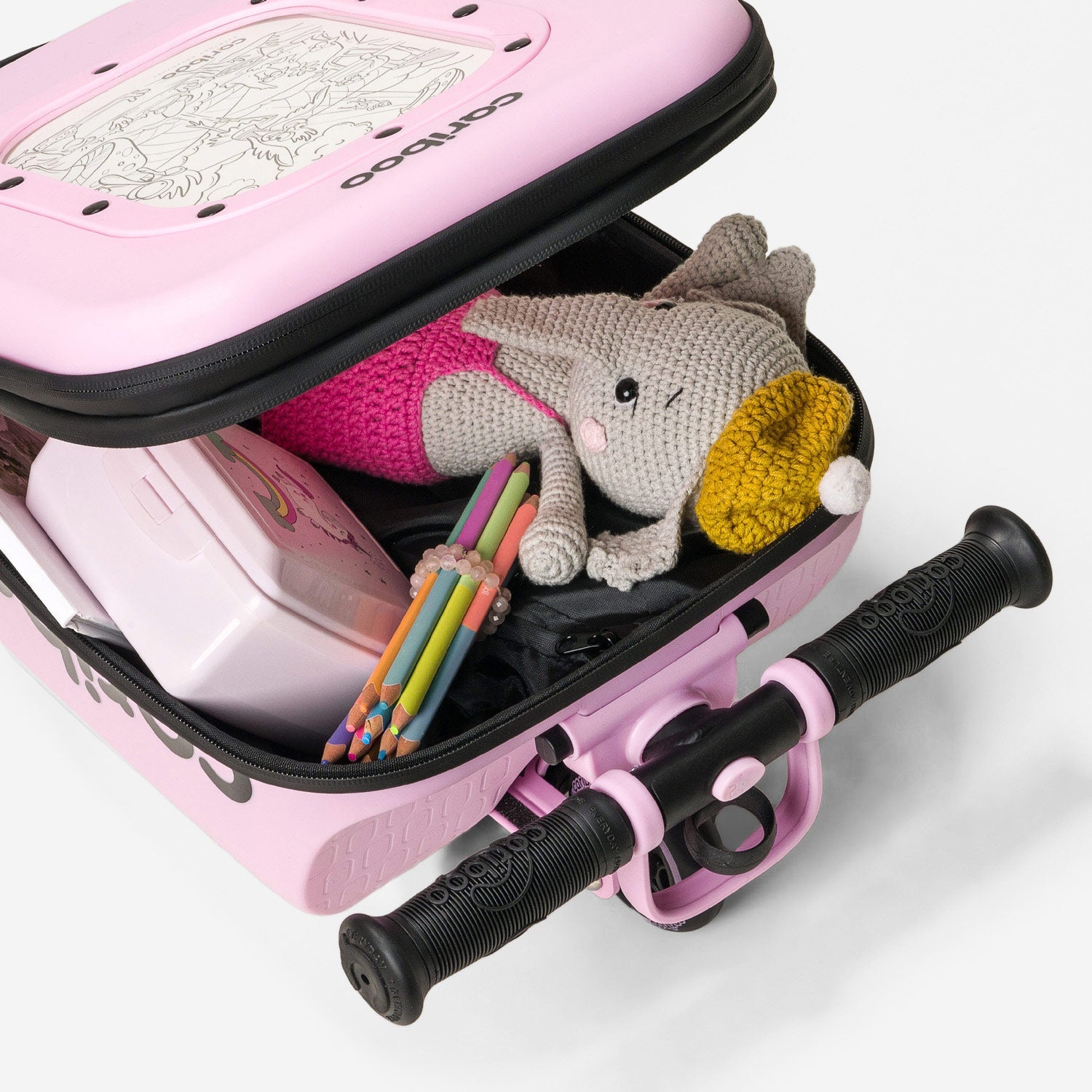 Introducing the Itravel Scooter, designed with a unique feature—a special window that lets your child peek into their luggage. If they prefer to keep their belongings a secret, they can cover it with a magnetic frame featuring a customizable picture. This illustration can be colored and decorated, giving the suitcase a personalized touch. This way, your child not only decides what to bring along but also how their gear looks.