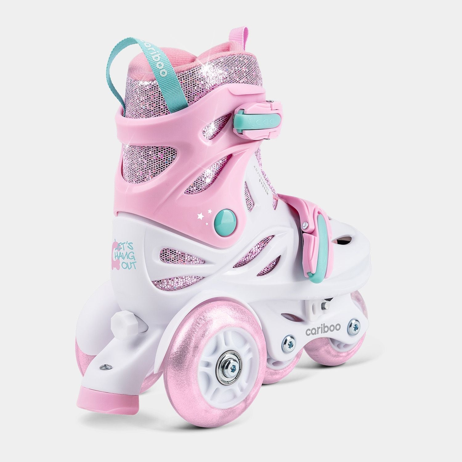 Diseño CuidadosoLos patines en línea Ballerina de Cariboo están diseñados para ayudar a los niños a dar sus primeros pasos en el patinaje. La construcción especial asegura estabilidad y facilita mucho el mantenimiento del equilibrio. Los patines cuentan con dos ruedas delanteras más pequeñas dispuestas como en los patines en línea clásicos, y dos ruedas traseras más grandes posicionadas como en los patines tradicionales. Este diseño garantiza un inicio seguro y placentero.