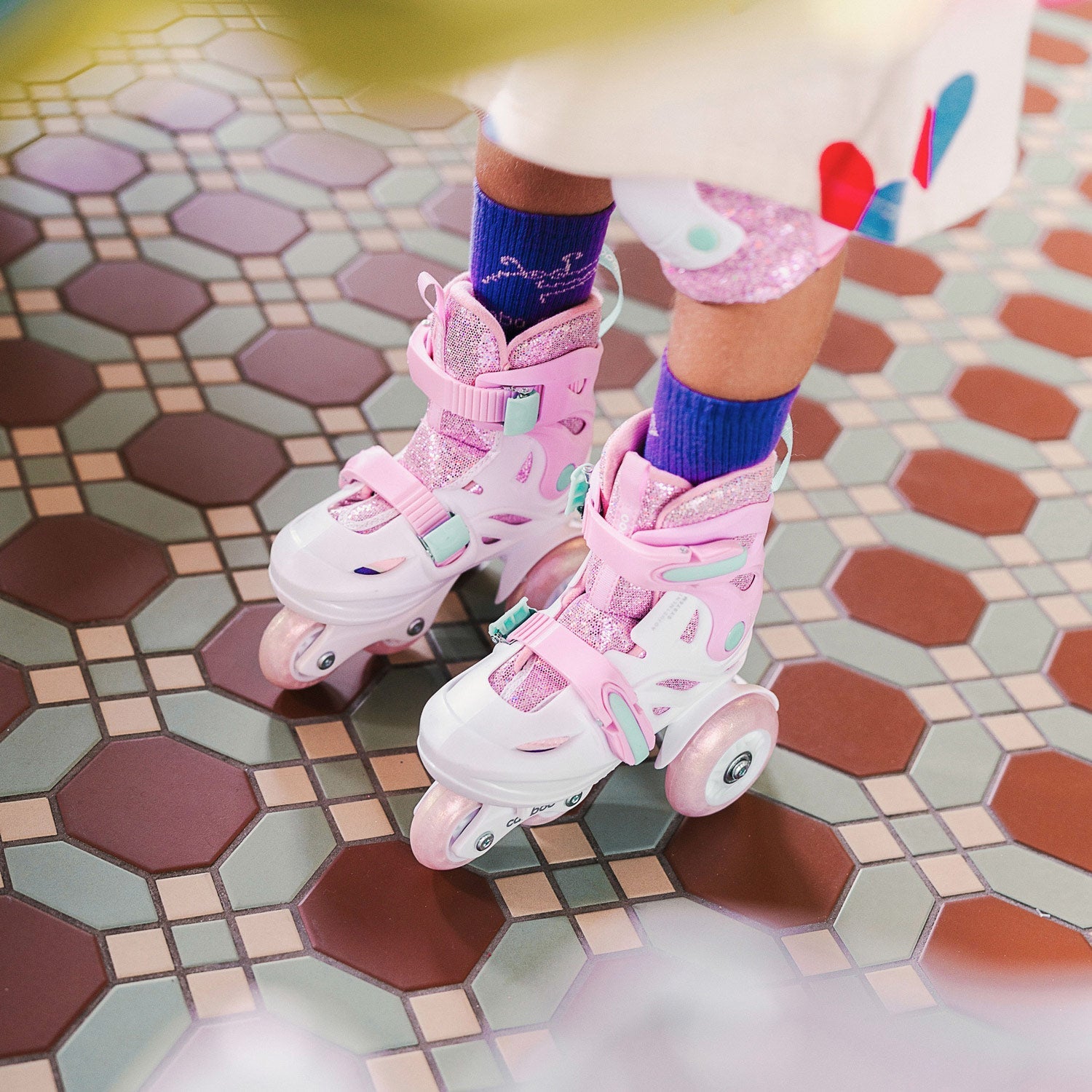 Cariboo Ballerina skates support the youngest users right from the first try, providing stability and a sense of security. At the front, there are two smaller wheels inspired by classic roller skates, and at the back, two larger wheels positioned like on quad skates – this arrangement helps maintain balance and adds courage. It's a method of learning that is associated with joy from the very beginning.