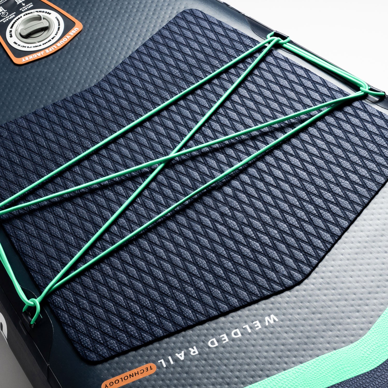 La tabla cuenta con zonas de almacenamiento designadas en la parte delantera y trasera. Las cuerdas elásticas y los resistentes anillos en D permiten sujetar con seguridad una mochila, una bolsa impermeable o equipamiento para los más pequeños. Así, todo lo que necesitas estará siempre a tu alcance, manteniendo la cubierta organizada y funcional.