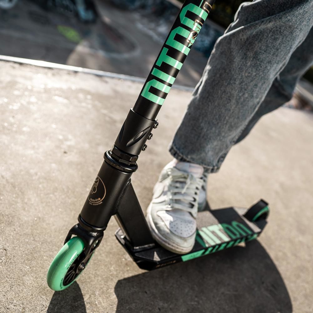 O travão flexível permite desacelerar efetivamente a roda traseira em movimento, e os punhos texturizados de 160 mm feitas de TPR asseguram uma pega firme. O Nitro é a sua entrada no mundo das manobras radicais! Esta trotinete abrirá as portas para um universo de truques e acrobacias aéreas!